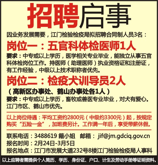 因业务发展需要,江门检验检疫局拟招聘合同制人员3名: