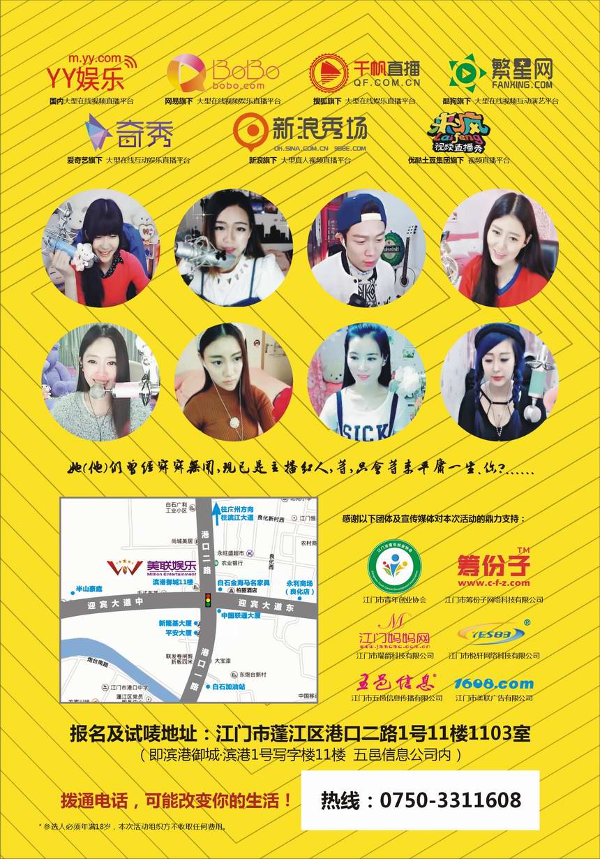 就是缺你 选择最优质的平台!正规轻松月入万元!不能再埋没自己了! 零起点没经验不要紧,只要真心努力,我们支持你! 时间灵活 坚持努力 唱歌跳舞 聊天MC皆可 公司提供优质培训 公司提供策划造星 *参选人必须年满18岁,本次活动组织方不收取任何费用。 预约面试地址:江门市港口二路1号11楼 (即滨港御城.滨港1号写字楼11楼1103室 五邑信息公司内) 报名电话:0750-3311608