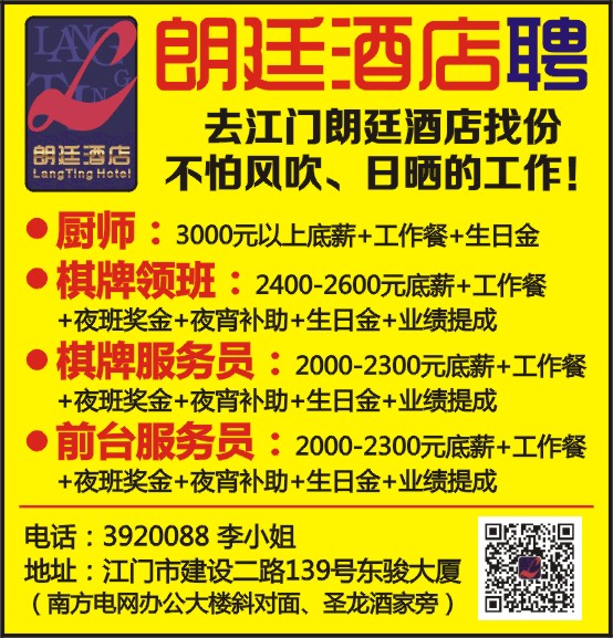 去江门朗廷酒店找份不怕风吹、日晒的工作!