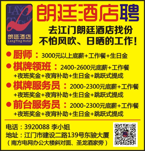 去江门朗廷酒店找份不怕风吹、日晒的工作!