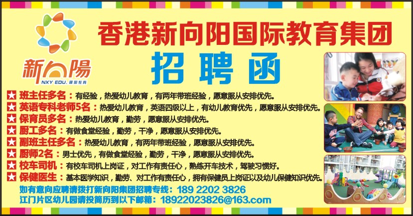 江门片区幼儿园请投简历到以下邮箱:18922023826@163.com |
