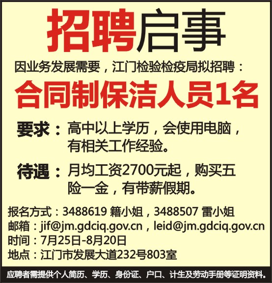 因业务发展需要,江门检验检疫局拟招聘: 合同制保洁人员1名 要求:高中以上学历,会使用电脑,有相关工作经验。 待遇:月均工资2700元起,购买五险一金,有带薪假期。 报名方式:3488619 籍小姐,3488507 雷小姐 邮箱:jif@jm.gdciq.gov.cn,leid@jm.gdciq.gov.cn 时间:7月25日-8月20日 地点:江门市发展大道232号803室 应聘者需提供个人简历、学历、身份证、户口、计生及劳动手册等证明资料。