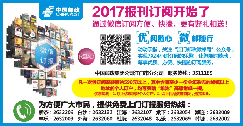 动动手指,关注“江门邮政微邮局”公众号,实现7X24小时订阅的乐趣,让您随时随地,尊享优质、方便、快捷的订阅服务。