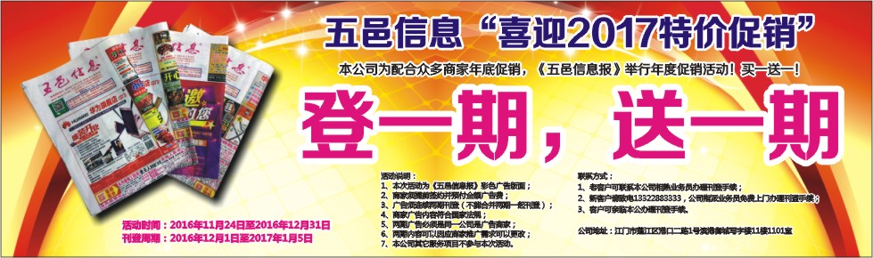 本公司为配合众多商家年底促销,《五邑信息报》举行年度促销活动!买一送一!