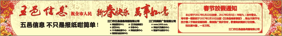 春节放假通知 本公司于2017年1月22日放假,2017年2月5日(年初九)启市营业。鸡年第一期报纸于2017年2月10日出版《五邑信息新春版》,配合元宵节与西方情人节商家促销档期,微信推广同步发布,敬请商家提前订位定稿。 祝生意兴隆,一本万利。 江门市五邑信息传播有限公司