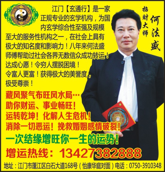 江门【玄通行】是一家正规专业的玄学机构,为国内玄学综合性至强及规模至大的服务性机构之一,在社会上具有极大的知名度和影响力!八年来何法盛师傅帮助过社会各界无数信众成功转运!达成心愿!令穷人摆脱困境!令富人更富!获得极大的美誉度,极受尊崇!