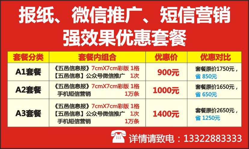A3套餐 《五邑信息报》7cmX7cm彩版 1格 【五邑信息】公众号微信推广1次 手机短信营销 1万条 1400元 详情请致电:13322883333