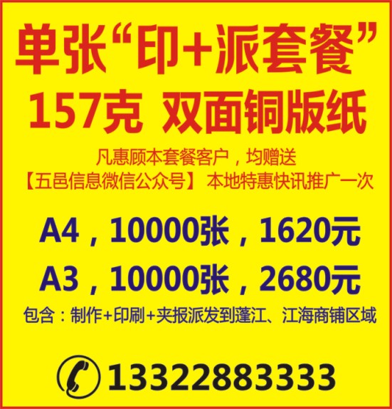 凡惠顾本套餐客户,均赠送【五邑信息微信公众号】 本地特惠快讯推广一次