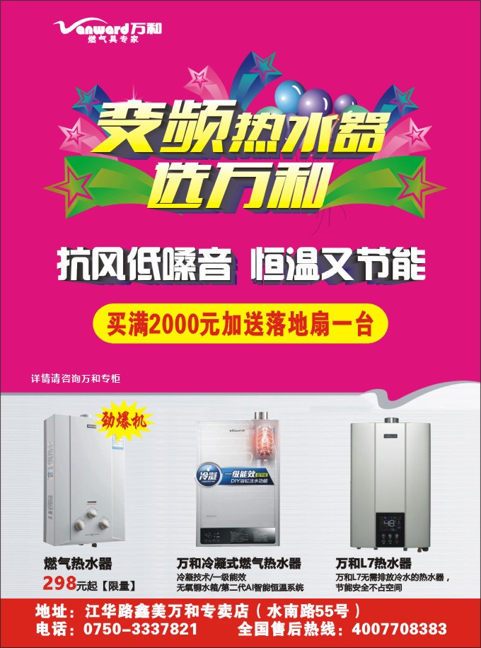 变频热水器 选万和 抗风低嗓音 恒温又节能 买满2000元加送落地扇一台 燃气热水器298元【限量】 万和冷凝式燃气热水器 冷凝技术/一级能效 无氧铜水箱/第二代AI智能恒温系统 万和L7热水器 万和L7无需排放冷水的热水器,节能安全不占空间 地址:江华路鑫美万和专卖店(水南路55号) 电话:0750-3337821 全国售后热线:4007708383