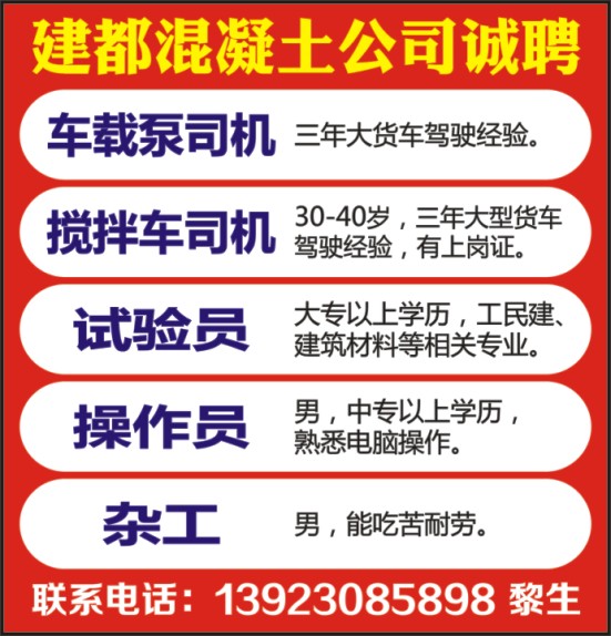 搅拌车司机:30-40岁,三年大型货车驾驶经验,有上岗证。