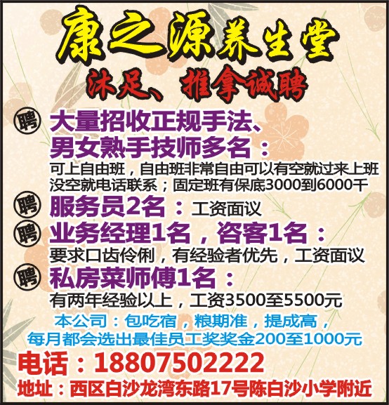 大量招收正规手法、男女熟手技师多名:可上自由班,自由班非常自由可以有空就过来上班没空就电话联系;固定班有保底3000到6000千