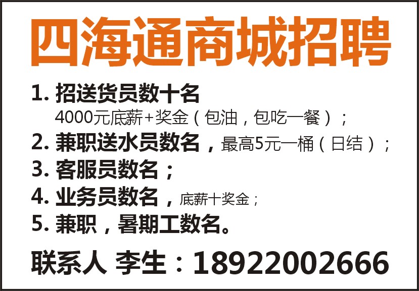 1. 招送货员数十名,4000元底薪+奖金(包油,包吃一餐);