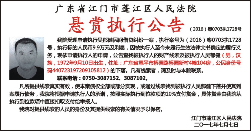 我院受理申请执行吴郁健民间借贷纠纷一案,执行案号为(2016)粤0703执1728号,执行标的人民币9.9万元及利息,因被执行人至今未履行生效法律文书确定的履行义务,现依申请执行人的申请,公告查找被执行人的财产线索及被执行人吴郁健(男,汉族,1972年9月10日出生,住址:广东省恩平市桥园路桥园新村4幢104房,公民身份号码440723197209105812)的下落。凡有线索者,请及时与本院联系。