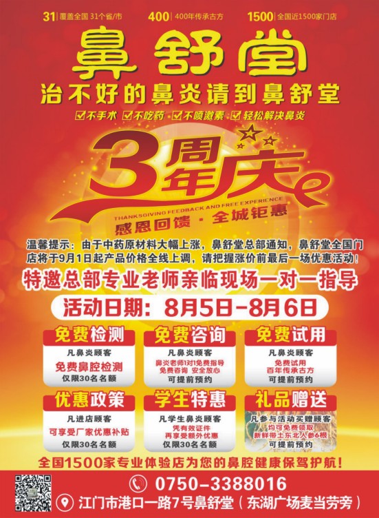 治不好的鼻炎请到鼻舒堂 3周年庆 感恩回馈·全城钜惠 特邀总部专业老师亲临现场一对一指导 活动日期:8月5日-8月6日 0750-3388016 江门市港口一路7号鼻舒堂(东湖广场麦当劳旁)