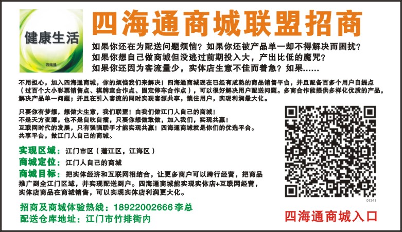 互联网时代的发展,只有强强联手才能实现共赢!四海通商城就是你们的优选平台。共享平台,做江门人自己的商城。