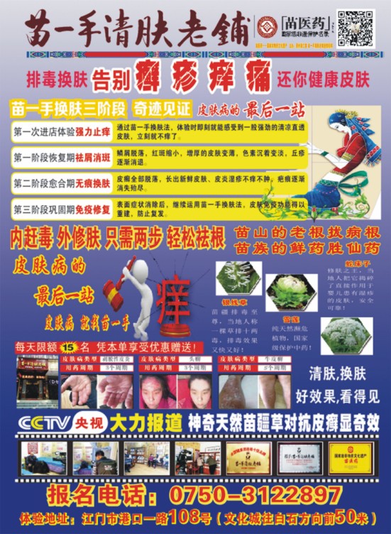 排毒换肤告别癣疹痒痛还你健康皮肤 苗一手换肤三阶段 奇迹见证 皮肤病的最后一站 内赶毒 外修肤 只需两步 轻松祛根 苗山的老根拔病根 苗族的鲜药胜仙药 皮肤病的最后一站 皮肤病就找苗一手 清肤,换肤 好效果,看得见 大力报道 神奇天然苗疆草对抗皮癣显奇效