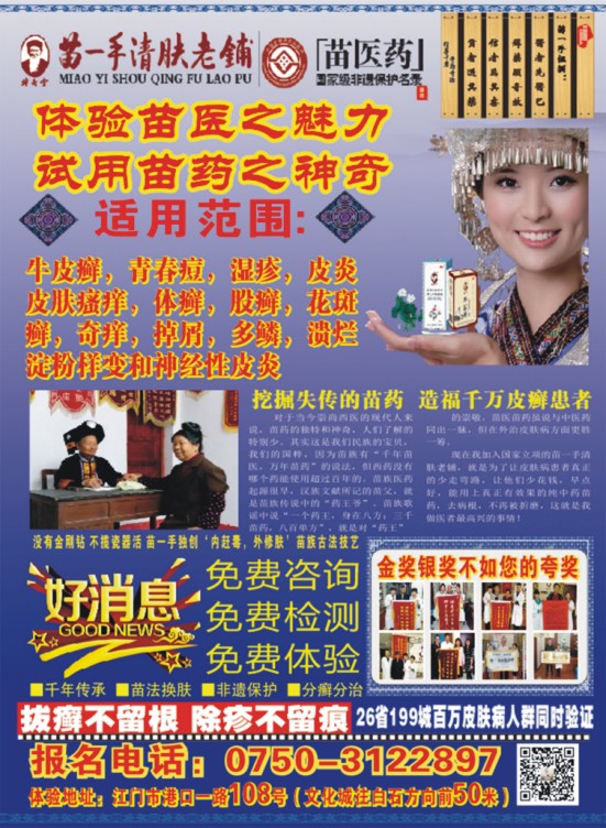体验苗医之魅力 试用苗药之神奇 适用范围: 牛皮癣,青春痘,湿疹,皮炎,皮肤瘙痒,体癣,肌癣,花斑癣,奇痒,掉屑,多鳞,溃烂,淀粉样变和神经性皮炎 好消息 免费咨询 免费检测 免费体验 报名电话:0750-3122897 体验地址:江门市港口一路108号(文化城往白石方向前50米)