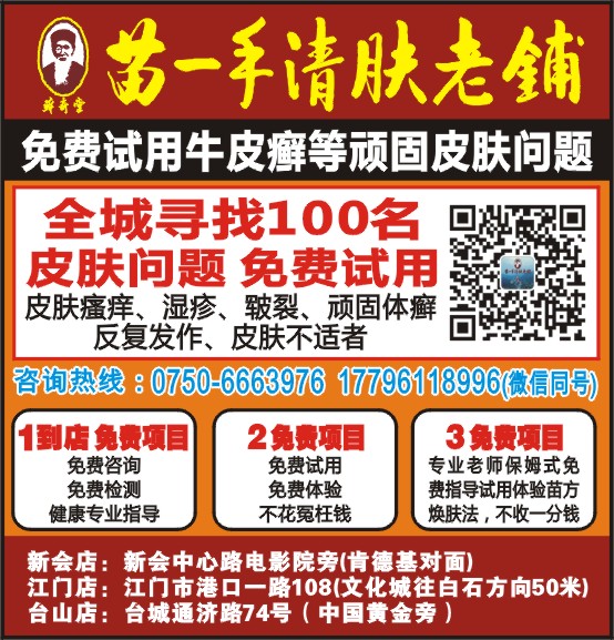 免费试用牛皮癣等顽固皮肤问题 全城寻找100名 皮肤问题 免费试用 皮肤瘙痒、湿疹、皲裂、顽固体癣、反复发作、皮肤不适者 咨询热线:0750-6663976 17796118996(微信同号)