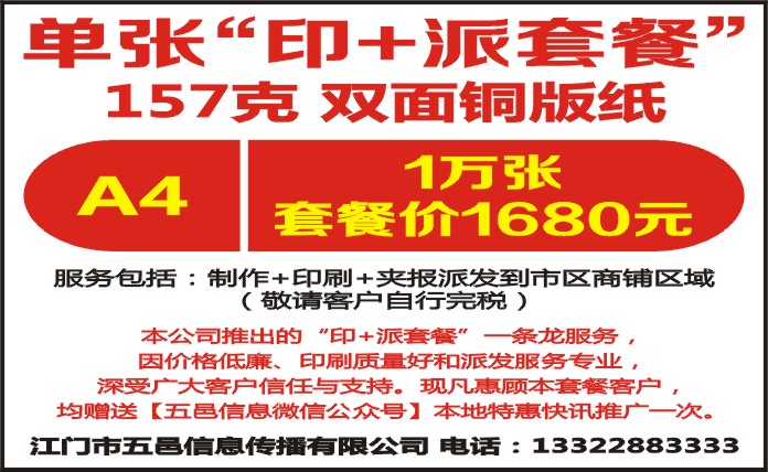 现凡惠顾本套餐客户,均赠送【五邑信息微信公众号】本地特惠快讯推广一次。