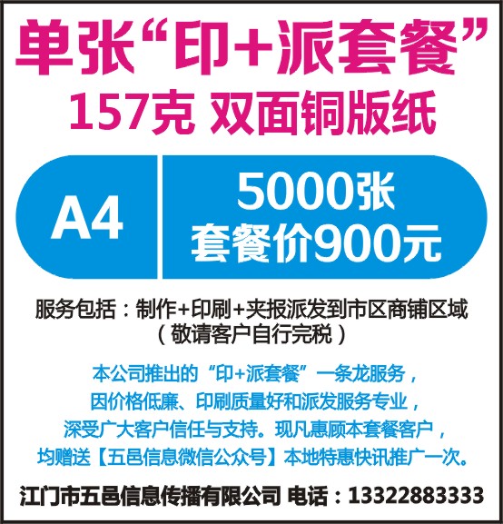现凡惠顾本套餐客户,均赠送【五邑信息微信公众号】本地特惠快讯推广一次。