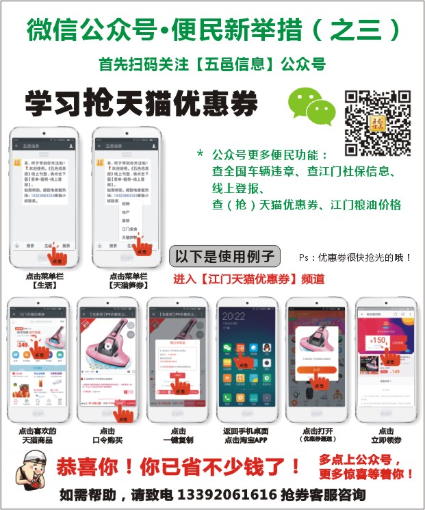 查全国车辆违章、查江门社保信息、线上登报、查(抢)天猫优惠券、江门粮油价格