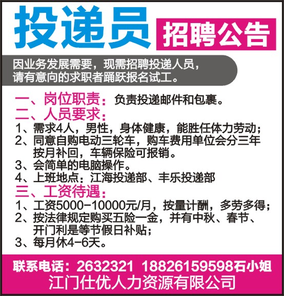 1、需求4人,男性,身体健康,能胜任体力劳动;