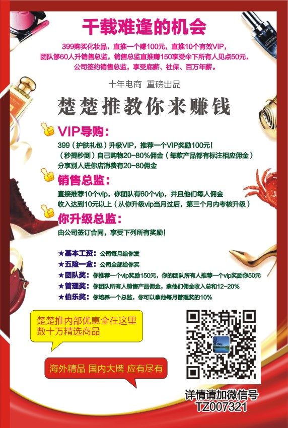 399购买化妆品,直推一个赚100元,直推10个有效VIP,团队够60人升销售总监,销售总监直推赚150享受伞下所有人见点50元,公司签约销售总监,享受底薪、社保、百万年薪。