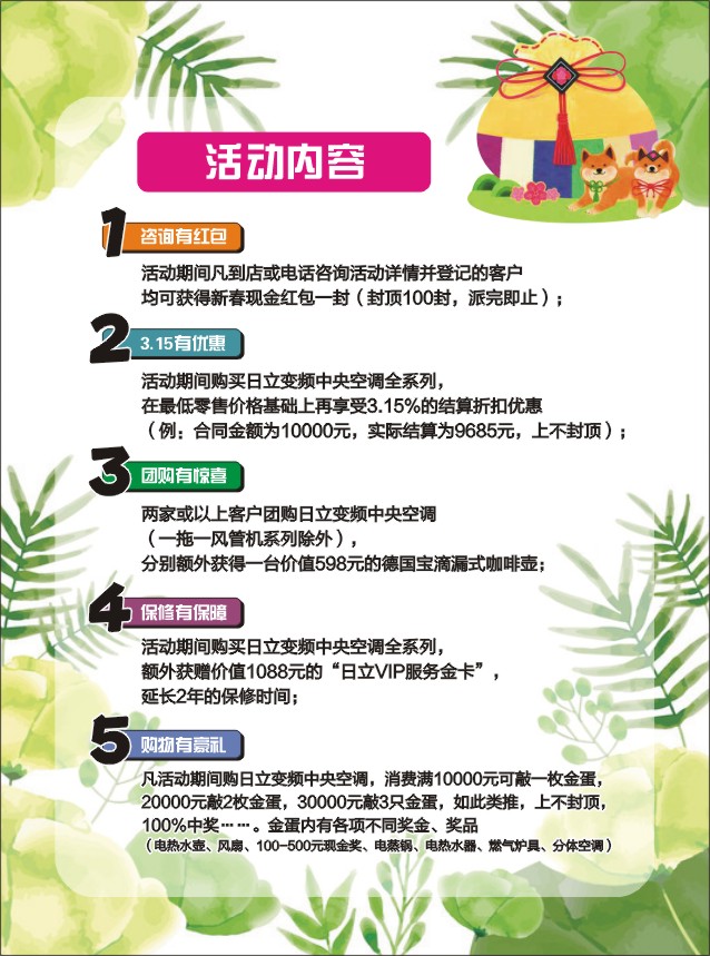 凡活动期间购日立变频中央空调,消费满10000元可敲一枚金蛋,20000元敲2枚金蛋,30000元敲3只金蛋,如此类推,上不封顶,100%中奖……。金蛋内有各项不同奖金、奖品(电热水壶、风扇、100-500元现金奖、电蒸锅、电热水器、燃气炉具、分体空调)