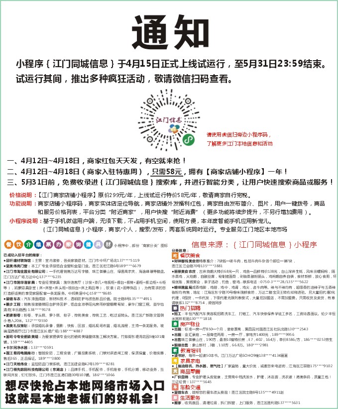 小程序{江门同城信息}于4月15日正式上线试运行,至5月31日23:59结束。