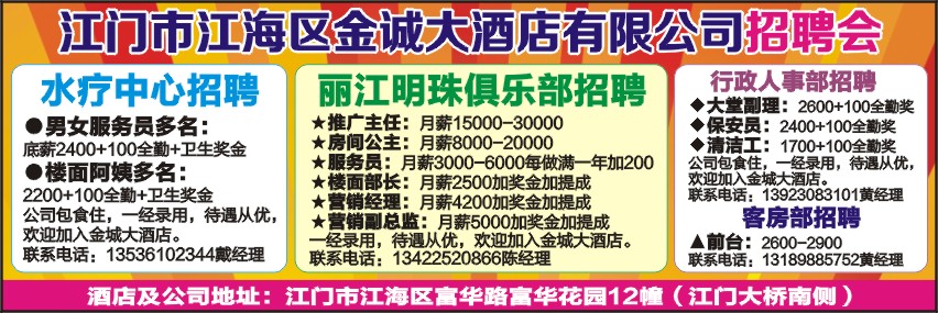 公司包食住,一经录用,待遇从优,欢迎加入金城大酒店。