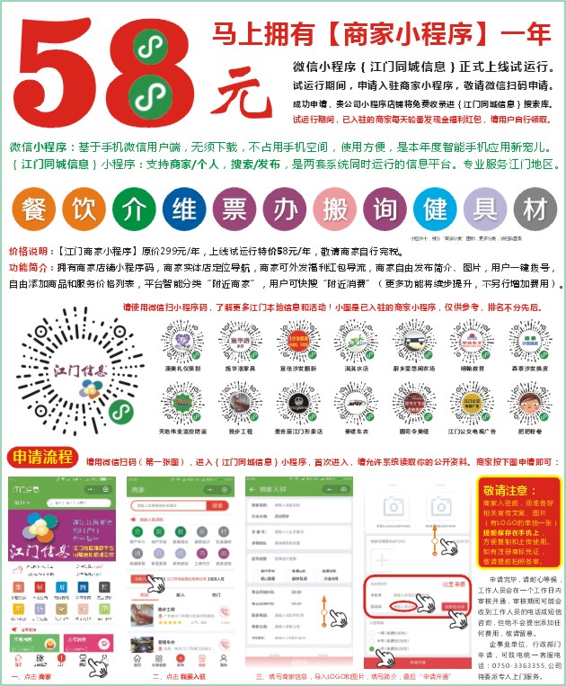 请用微信扫码(第一张图),进入{江门同城信息}小程序,首次进入,请允许系统读取你的公开资料。商家按下图申请即可: