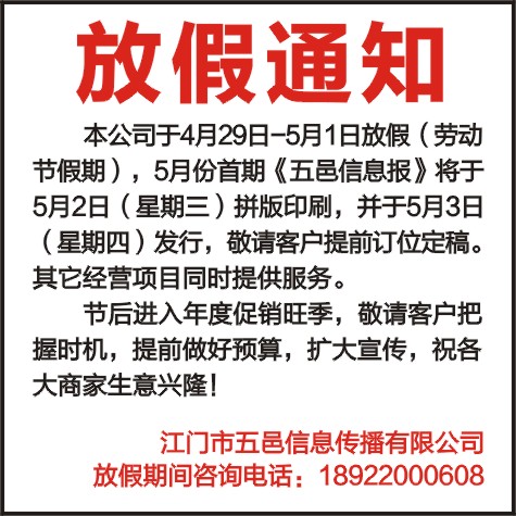 本公司于4月29日-5月1日放假(劳动节假期),5月份首期《五邑信息报》将于5月2日(星期三)拼版印刷,并于5月3日(星期四)发行,敬请客户提前订位定稿。其它经营项目同时提供服务。