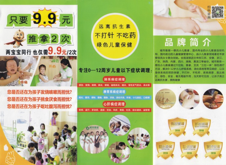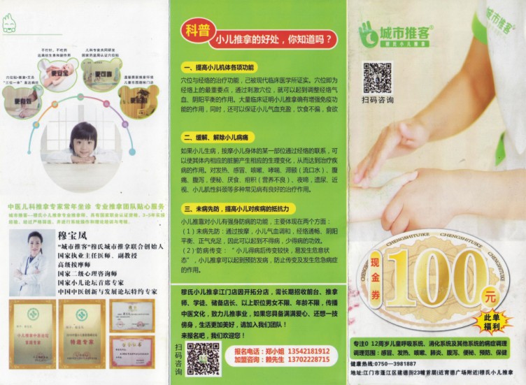 专注0-12周岁儿童呼吸系统、消化系统及其他系统的病症调理 调理范围:感冒、发热、咳嗽、肺炎、腹泻、便秘、预防、保健 只要9.9元 推拿2次 两宝宝同行也仅需9.9元/2次 远离抗生素 不打针 不吃药 绿色儿童保健 健康热线:0750-3981887 地址:江门市蓬江区建德街23幢首层(近育德广场附近)穆氏小儿推拿