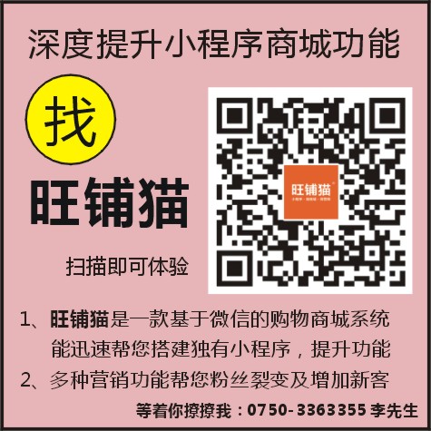 1、旺铺猫是一款基于微信的购物商城系统能迅速帮您搭建独有小程序,提升功能