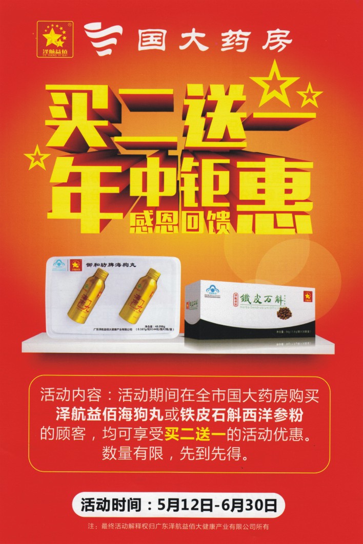 活动内容:活动期间在全市国大药房购买泽航益佰海狗丸或铁皮石斛西洋参粉的顾客,均可享受买二送一的活动优惠。数量有限,先到先得。