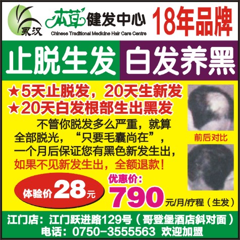 不管你脱发多么严重,就算全部脱光,“只要毛囊尚在”,一个月后保证您有黑色新发生出,如果不见新发生出,全额退款!