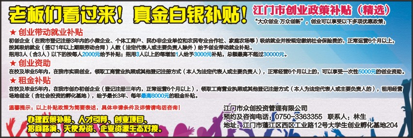 地址:江门市蓬江区西区工业路12号大学生创业孵化基地204