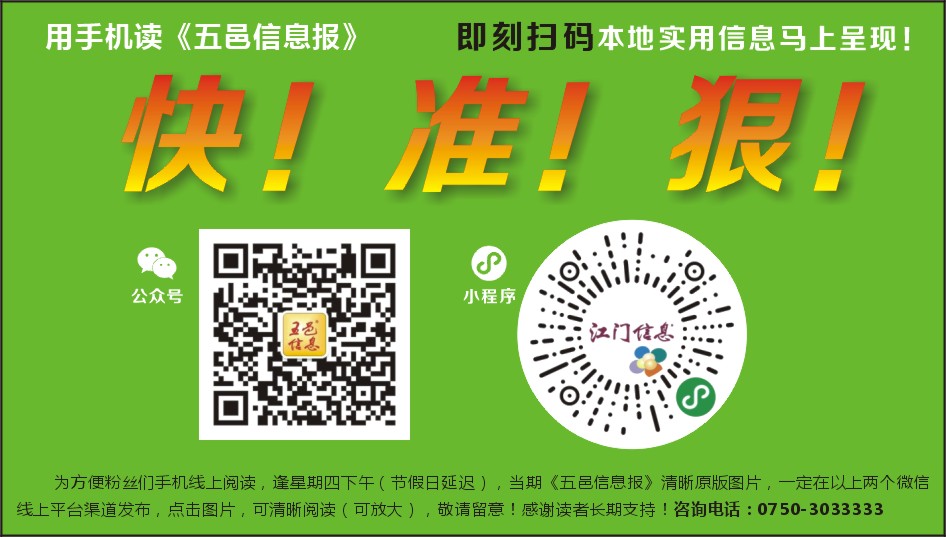 为方便粉丝们手机线上阅读,逢星期四下午(节假日延迟),当期《五邑信息报》清晰原版图片,一定在以上两个微信线上平台渠道发布,点击图片,可清晰阅读(可放大),敬请留意!感谢读者长期支持!咨询电话:0750-3033333