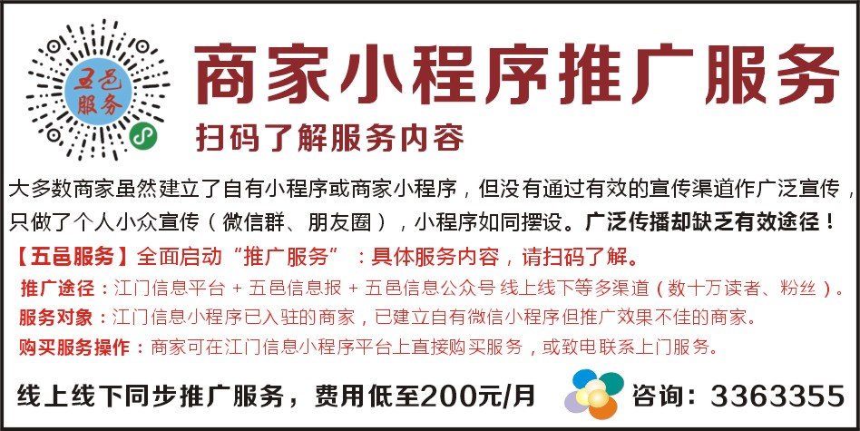推广途径:江门信息平台 + 五邑信息报 + 五邑信息公众号 线上线下等多渠道(数十万读者、粉丝)。