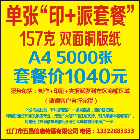 服务包括:制作+印刷+夹报派发到市区商铺区域(敬请客户自行完税)