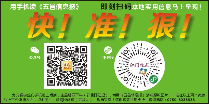 为方便粉丝们手机线上阅读,逢星期四下午(节假日延迟),当期《五邑信息报》清晰原版图片,一定在以上两个微信线上平台渠道发布,点击图片,可清晰阅读(可放大),敬请留意!感谢读者长期支持!咨询电话:0750-3033333