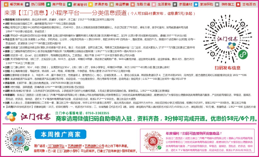 来源【江门信息】小程序平台——分类信息频道(个人可扫码付费发布,信息费5元/条起)