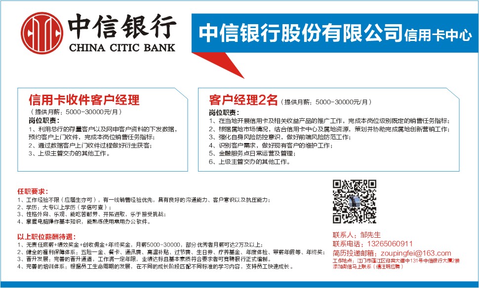 工作地点:江门市蓬江区迎宾大道中131号中信银行大厦2楼