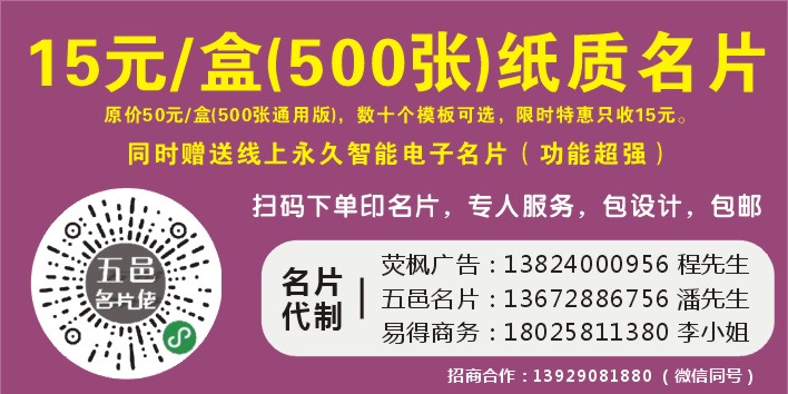 原价50元/盒(500张通用版),数十个模板可选,限时特惠只收15元。