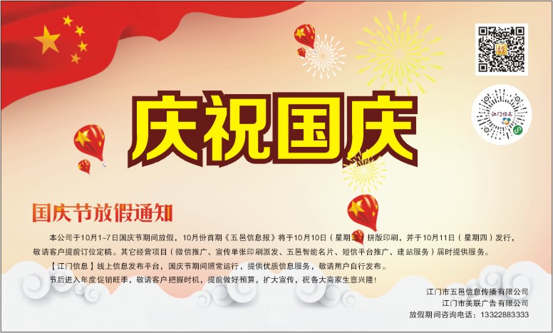 本公司于10月1~7日国庆节期间放假,10月份首期《五邑信息报》将于10月10日(星期三)拼版印刷,并于10月11日(星期四)发行,