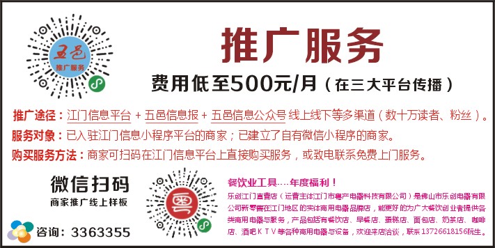 推广途径:江门信息平台 + 五邑信息报 + 五邑信息公众号 线上线下等多渠道(数十万读者、粉丝)。