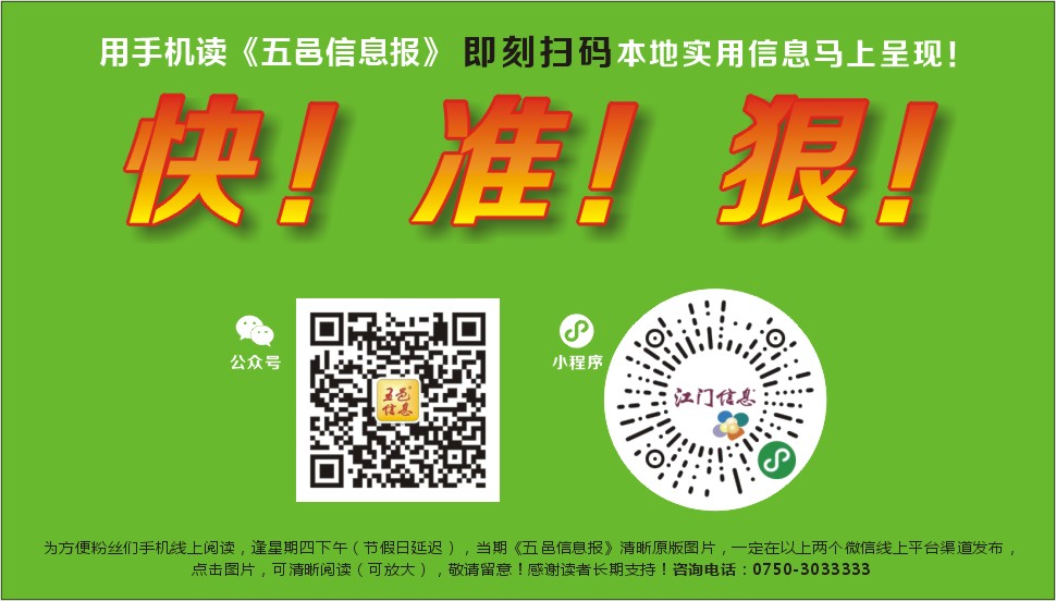 为方便粉丝们手机线上阅读,逢星期四下午(节假日延迟),当期《五邑信息报》清晰原版图片,一定在以上两个微信线上平台渠道发布,点击图片,可清晰阅读(可放大),敬请留意!感谢读者长期支持!咨询电话:0750-3033333