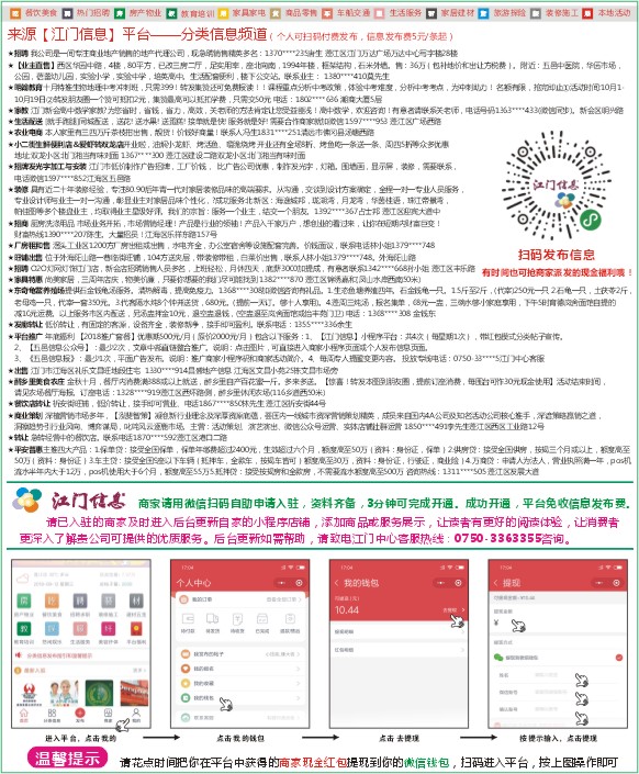 ★平台推广 年底福利 【2018推广套餐】优惠期500元/月(原价2000元/月)包含以下服务:1、【江门信息】小程序平台:共4次(每星期1次),带红包模式分类帖子宣传。2、【五邑信息公众号】:最少2次,文章中部直链整合推广。说明:点击图片,可直接进入商家小程序页面或个人发布信息页面。3、《五邑信息报》:最少1次,平面广告发布。说明:推广商家小程序码和商家活动简介。4、每周专人提醒变更内容。 投放专线电话:0750-33****5江门中心客服