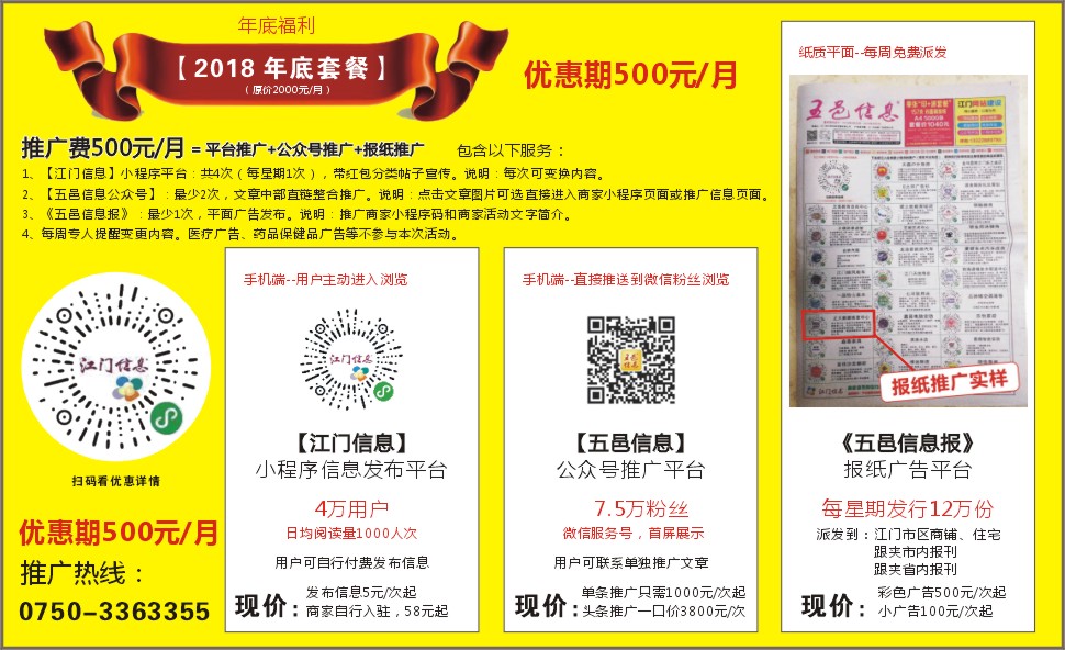 3、《五邑信息报》:最少1次,平面广告发布。说明:推广商家小程序码和商家活动文字简介。