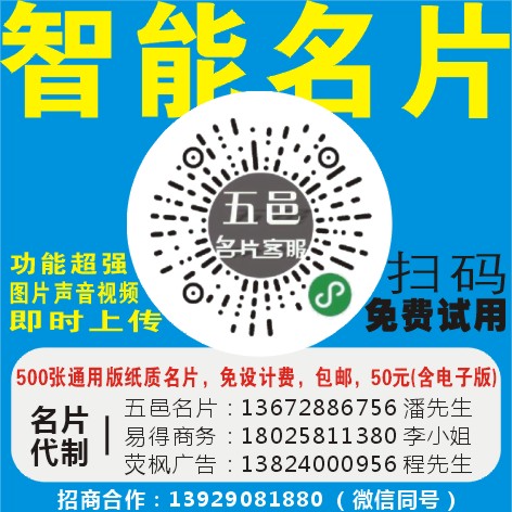 500张通用版纸质名片,免设计费,包邮,50元(含电子版)